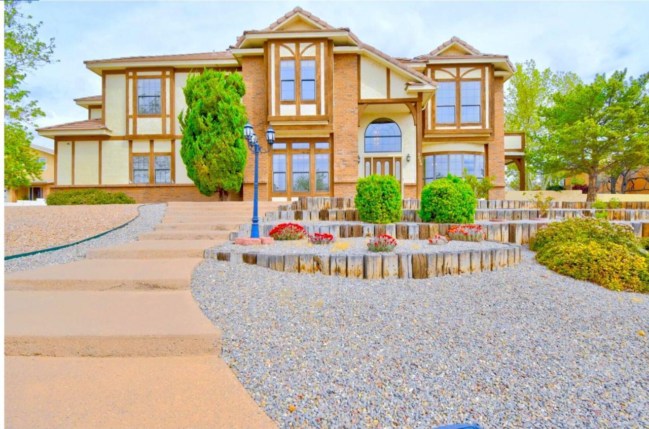 Beautiful Custom English Tudor ! Featuring 6 Bedrooms 4 Bathrooms And Over 3700 SquareFeet on .46 of an Acre ! Freshly Painted and Bright! Amazing View Deck Off Primary Suite with Views of the Sandias ! And features a Luxury Bath with Roman Tub. The Family Room has Soaring Ceilings and a Fireplace that Opens to the Large Country Kitchen with Massive Island and Nook! Checkout the Enormous Pantry . Formal Dining Room with French Doors opens to a Covered Patio ! Formal Front Room and Entry with Private Office to The Side ! A Grand Staircase leads to the Upstairs Living Areas ! Expansive Park Like Backyard With Many Trees ! There is also a RV parking Area. Easy access to walking trails to the Bosque ! Located on a Secluded Cul De Sac !