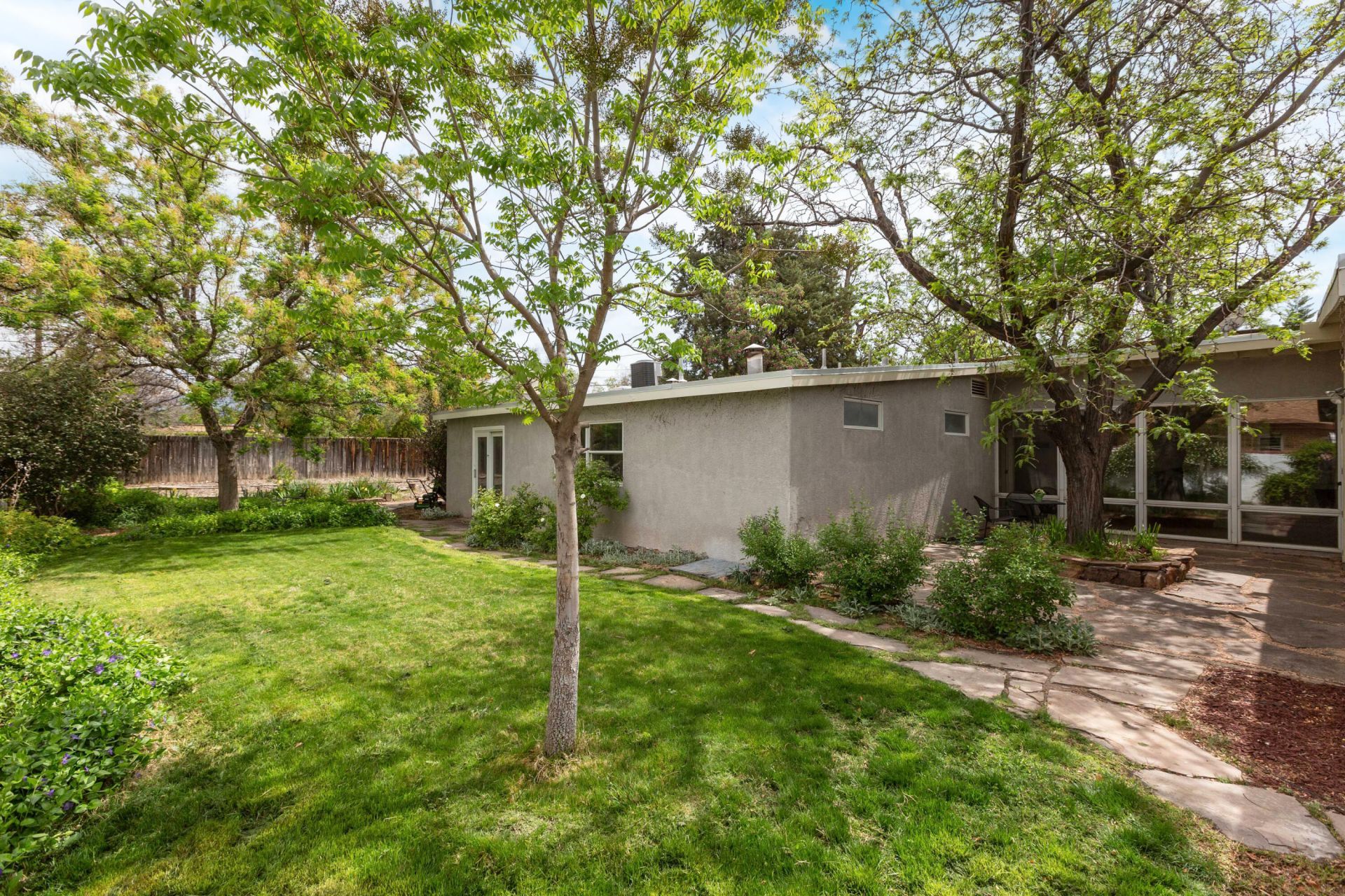 Amazing mid-century La Hacienda gem on a .32-acre lot--single-level living with a dramatic wall of windows in the living/dining areas overlooking a private courtyard with mature locust, trumpet vine and roses for seamless indoor-outdoor flow. Sunny remodeled kitchen with built-in dining banco, gas cooktop, refrigerator and ample storage. Spacious den with built-in desk and two closets. Two master suites (one with fireplace), three baths, herringbone parquet floors, thermal windows, extensive built-ins and generous storage. Updates: roof and refrigerated air (2020), two gas furnaces and water heater (2018). Professionally designed xeriscape with sprinklers and bubblers, one-car garage plus carport with EV charger. Easy access to UNM law and medical schools and nearby golf.